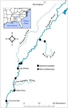 The waters of the Cahaba are home to more than 131 species of freshwater fishes (18 of which have been found in no other river system), 40 species of mussels, and 35 species of snails. The river has more fish species than can be found in all bodies of water in California.[7] Sixty-nine of these animal species are endangered. The endemic freshwater snail Elimia cahawbensis is named after the river. One species long thought to be extinct, Leptoxis compacta, the Oblong rocksnail, was rediscovered in the Cahaba in 2011.[8] Due to damming for hydropower, pollution, transportation, and erosion, it has suffered losses of species. Almost a quarter of the original documented mussel species in the Cahaba have disappeared with similar trends in the fish and snail numbers of species. Many species have still been discovered and rediscovered in and on the surrounding region of the river. The Cahaba is also home to 13 snail species not found anywhere else in the world. In the early 21st century, a Georgia botanist Jim Allison discovered eight unknown flower species, and later eight more were identified along the river's course that previously had not been sited in the state of Alabama. This region is most noted for containing numerous species of mollusks and snails. These species feed other aquatic dwelling animals, improve water quality by eating algae, and even indicate environmental issues due to their receptiveness of pollution. Fourteen of the freshwater fish species are non-native species in the Cahaba River.[3]
