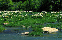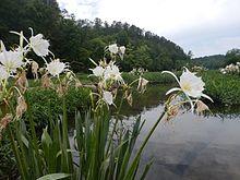 Among the countless plant species that thrive in and around the Cahaba is Hymenocallis coronaria, known in Alabama as the Cahaba lily. As a result of its abundant presence here and its threatened status in the three states where it is found, a portion of the Cahaba River near West Blocton has been designated as the Cahaba River National Wildlife Refuge.[9][10] It is found only in South Carolina, Georgia, and Alabama.[11] While this flower once was present through all of the Southeast, it now exists in about 70 stands with a fourth of the stands in the Cahaba River. The seeds travel with the river's flow, and crevices in the shoals (rocky bars that run across the river) shelter the seeds as they sprout. The Cahaba lilies bloom in early May, and the entire blooming season is through by mid-June.[11] The flowers open in the evening instead of the day due to pollination by sphinx moths, which are active at night.[5] Each flower blooms and lasts only one day before wilting.[11]