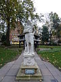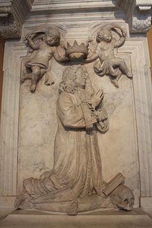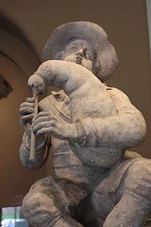Many of his works were, or are, on public display in London, including his statue of Charles II (1681), which still stands (rather worn away) in Soho Square. He made two lifelike human statues in Portland stone entitled "Melancholy" and "Raving Madness" for the gates of the 17th century mental hospital, known as Bedlam (now Bethlem Royal Hospital), which can currently be seen in their museum (modelli in V&A). They were said to be modelled on two inmates of the asylum, one of whom was Oliver Cromwell's mad porter, Daniel.[11] The two statues became his most famous work, and were mentioned in Alexander Pope's satire The Dunciad.[12] He also created the bas reliefs on the base of the Monument to the Great Fire of London; his reliefs at the Royal Exchange have been destroyed. He produced sets of sculpture for Trinity College, Cambridge, and for the Danish Church on Wellclose Square, where he is buried.[13][14][1]