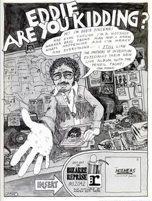 The first large Zappa project he worked on was the cover for We're Only in It for the Money, a parody of the Beatles' album Sgt Pepper's Lonely Hearts Club Band. Schenkel built plaster figures, helped set up the staging for the photo (at Zappa's direction), and put together the collage of people in the background.[3][1] Schenkel also made advertising comics published in comics magazines, which promoted Zappa's latest releases.[1] Some of these comics have been made available in Michel Choquette's compilation book The Someday Funnies.[4]