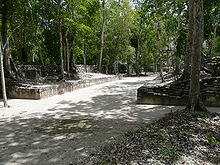 The site is surrounded by an extensive network of canals and reservoirs.[7] There are five major reservoirs, including the largest example in the Maya world, measuring 242 by 212 metres (794 by 696 ft).[41] This reservoir is filled by a small seasonal river during the rainy season and continues to hold enough water for it to be used by archaeologists in modern times.[41]