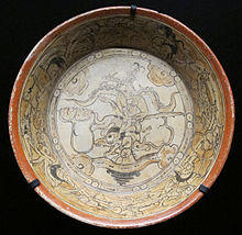 Yuknoom Yich'aak K'ak' succeeded Yuknoom Che'en II, his crowning on 3 April 686 was recorded on monuments at Dos Pilas and El Peru.[53] He was born in 649 and was likely to have been the son of his predecessor. He already held high office before he was named king and may have been responsible for the major successes of the latter part of Yuknoom Che'en II's reign.[53] He retained the loyalty of K'inich B'alam of El Peru and B'alaj Chan K'awiil of Dos Pilas and gained that of K'ak' Tiliw Chan Chaak in 693, when he was installed on the throne of Naranjo at the age of five.[53] However, the texts on sculpted monuments do not reveal the full complexity of diplomatic activity, as revealed by a painted ceramic vase from Tikal, which depicts an ambassador of Calakmul's king kneeling before the enthroned king of Tikal and delivering tribute.[53] Just four years later, in August 695, the two states were once again at war. Yuknoom Yich'aak K'ak' led his warriors against Jasaw Chan K'awiil I in a catastrophic battle that saw the defeat of Calakmul and the capture of the image of a Calakmul deity named Yajaw Maan.[54] It is unknown what happened to Yuknoom Yich'aak K'ak'; a stucco sculpture from Tikal shows a captive and the king is mentioned in the accompanying caption but it is not certain if the captive and the king are the same person.[55] This event marked the end of Calakmul's apogee, with diplomatic activity dropping away and fewer cities recognising Calakmul's king as overlord.[55] No stelae remain standing in the site core recording Yuknoom Yich'aal K'ak, although there are some in the Northeast Group and 2 broken stelae were buried in Structure 2.[55]