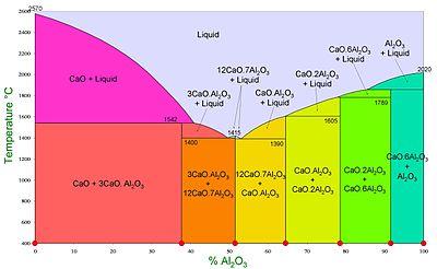 The main active constituent of calcium aluminate cements is monocalcium aluminate (CaAl2O4, CaO · Al2O3, or CA in the cement chemist notation). It usually contains other calcium aluminates as well as a number of less reactive phases deriving from impurities in the raw materials. Rather a wide range of compositions is encountered, depending on the application and the purity of aluminium source used.[3] Constituents of some typical formulations include: