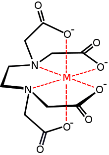 In coordination chemistry, EDTA4− is a member of the aminopolycarboxylic acid family of ligands. EDTA4− usually binds to a metal cation through its two amines and four carboxylates. Many of the resulting coordination compounds adopt octahedral geometry. Although of little consequence for its applications, these octahedral complexes are chiral. The cobalt(III) anion [Co(EDTA)] has been resolved into enantiomers.[25] Many complexes of EDTA4− adopt more complex structures due to either the formation of an additional bond to water, i.e. seven-coordinate complexes, or the displacement of one carboxylate arm by water. The iron(III) complex of EDTA is seven-coordinate.[26] Early work on the development of EDTA was undertaken by Gerold Schwarzenbach in the 1940s.[27] EDTA forms especially strong complexes with Mn(II), Cu(II), Fe(III), Pb(II) and Co(III).[28]