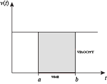 When velocity is constant, the total distance traveled over the given time interval can be computed by multiplying velocity and time. For example, travelling a steady 50 mph for 3 hours results in a total distance of 150 miles. In the diagram on the left, when constant velocity and time are graphed, these two values form a rectangle with height equal to the velocity and width equal to the time elapsed. Therefore, the product of velocity and time also calculates the rectangular area under the (constant) velocity curve. This connection between the area under a curve and distance traveled can be extended to any irregularly shaped region exhibiting a fluctuating velocity over a given time period. If f(x) in the diagram on the right represents speed as it varies over time, the distance traveled (between the times represented by a and b) is the area of the shaded region s.