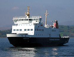 MV Loch Seaforth, at 116 m (381 ft) in length the largest vessel in the fleet, operates on the Ullapool to Stornoway, Lewis crossing. MV Caledonian Isles has the highest passenger capacity and can carry 1000 people on the Ardrossan to Brodick, Arran crossing. MV Hebrides crosses The Minch from Uig, Skye, while MV Isle of Mull, MV Isle of Lewis and MV Clansman are based in Oban, serving Mull, Coll, Colonsay, Tiree and the Outer Hebrides. MV Lord of the Isles is based in Mallaig and serves Armadale and South Uist. MV Finlaggan and MV Hebridean Isles serve Islay from Kennacraig.[1] During the summer, MV Isle of Arran, replaced at Islay in 2011,[2] supplements the Ardrossan - Brodick service and sails to Campbeltown. She is a spare vessel during the winter months.