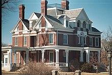 This mansion was built in 1867 by Niles Rice. The Victorian home has 12-foot (3.7 m) ceilings, six-foot hallways, and 36 narrow seven-foot windows. It is currently a private residence.[17]