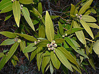 The tree was formerly known as Oreodaphne californica.[2] In Yuki, it is called pōl’-cum ōl.[3] In Oregon, this tree is known as Oregon myrtle, while in California it is called California bay laurel, which may be shortened to California bay[4] or California laurel. It has also been called pepperwood, spicebush, cinnamon bush, peppernut tree, headache tree,[5] mountain laurel,[6] and balm of heaven.[6]