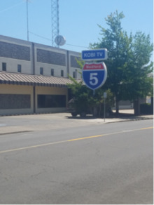 For many years, KOBI branded itself as "Channel 5M," with a logo showing a "5" on an interstate highway sign, reflecting the interstate that goes through the Medford area, Interstate 5. The interstate sign motif was later extended to KOTI and KRCR. KOBI rebranded itself as "The News Channel" in 1998 and as "NBC 5" in 2004, but the highway sign remains today.