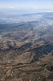 The southern portion of the freeway, from I-5 to the Avenue D exit near Lancaster, has been designated the Antelope Valley Freeway by the state legislature.[6] The Antelope Valley Freeway begins in the Santa Susana Mountains at the Newhall Pass interchange by splitting from the Golden State Freeway (I-5). This is the busiest portion of the route with an annual average daily traffic (AADT) count of 169,000 vehicles per day.[7] The freeway forms much of the eastern boundary of Santa Clarita along its route. Past Santa Clarita, the road continues northeast and crosses the Sierra Pelona Mountains and western San Gabriel Mountains via the canyon of the seasonal Santa Clara River. The ascent is mostly rugged and rural terrain, with only two small towns along the ascent, first Agua Dulce and later Acton. In Agua Dulce, the freeway forms the southern boundary of Vasquez Rocks Park, a county park. The highway crests the Sierra Pelona Mountains via Escondido Summit, at an elevation of 3,258 feet (993 m), before descending and passing by Acton to the north. The highway then crests the San Gabriel Mountains via Soledad Pass, at an elevation of 3,209 feet (978 m).[8] The route of the highway through the mountains loosely parallels that of the main line of the Southern Pacific Railroad, which is also used for the Metrolink Antelope Valley Line.[9][10]
