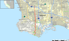 Except where prefixed with a letter, postmiles were measured on the road as it was in 1964, based on the alignment that existed at the time, and do not necessarily reflect current mileage. R reflects a realignment in the route since then, M indicates a second realignment, L refers an overlap due to a correction or change, and T indicates postmiles classified as temporary (for a full list of prefixes, see the list of postmile definitions).[1] Segments that remain unconstructed or have been relinquished to local control may be omitted. The entire route is in Los Angeles County.