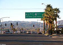 SR 62 is part of the California Freeway and Expressway System,[4] and west of the military base is part of the National Highway System,[5] a network of highways that are considered essential to the country's economy, defense, and mobility by the Federal Highway Administration.[6] SR 62 is eligible for the State Scenic Highway System,[7] and is recognized by Caltrans as a scenic highway for 9 miles (14 km) from its western terminus at I-10 to the Riverside–San Bernardino county line,[8] meaning that it is a substantial section of highway passing through a "memorable landscape" with no "visual intrusions", where the potential designation has gained popular favor with the community.[9] SR 62 is designated as a Blue Star Memorial Highway from Interstate 10 to Adobe Road in Twentynine Palms. SR 62 is known as the Twentynine Palms Highway from I-10 to SR 177.[10]