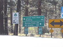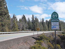 State Route 89 (SR 89) is a state highway in the U.S. state of California that travels in the north–south direction, serving as a major thoroughfare for many mountain communities in the Sierra Nevada and the Cascade Range. It starts from U.S. Route 395 near Topaz Lake, winding its way up to the 8,314-foot (2,534 m) Monitor Pass, down to the Carson River, and up again over the 7,740-foot (2,359 m) Luther Pass. From that point on, the route generally loses elevation on its way past Lake Tahoe, through Tahoe and Plumas National Forests until Lake Almanor. For roughly nine miles the route is then a part of State Route 36. The route then ascends to the 5,753-foot (1,754 m) Morgan Summit. After it enters Lassen Volcanic National Park it continues to gain elevation until it reaches its highest point in an unnamed pass in the middle of Lassen Peak and Bumpass Mountain. The road then descends and heads northwest, finally terminating at Interstate 5 at the foot of Mount Shasta at around 3,600 feet (1,100 m).[3][4]