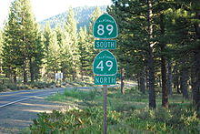 SR 89 is part of the California Freeway and Expressway System,[8] and north of the southern SR 44 junction is part of the National Highway System,[9] a network of highways that are considered essential to the country's economy, defense, and mobility by the Federal Highway Administration.[10] SR 89 is eligible for the State Scenic Highway System;[11] however, it is only a scenic highway as designated by Caltrans from the El Dorado-Placer county line to a point 3.2 miles west of the US 395 junction,[12] meaning that it is a substantial section of highway passing through a "memorable landscape" with no "visual intrusions", where the potential designation has gained popular favor with the community.[13] From the junction with SR 147, through the park and including the gap on SR 44, to its terminus at I-5, SR 89 is part of the Volcanic Legacy Scenic Byway, a National Scenic Byway.[14] The segment of SR 89 from I-80 in Truckee to SR 49 through Sattley also forms part of the Yuba-Donner Scenic Byway, a National Forest Scenic Byway.[15]