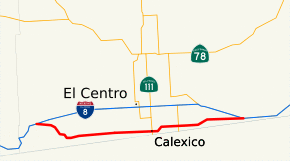 Except where prefixed with a letter, postmiles were measured on the road as it was in 1964, based on the alignment that existed at the time, and do not necessarily reflect current mileage. R reflects a realignment in the route since then, M indicates a second realignment, L refers an overlap due to a correction or change, and T indicates postmiles classified as temporary (for a full list of prefixes, see the list of postmile definitions).[2] Segments that remain unconstructed or have been relinquished to local control may be omitted. The entire route is in Imperial County.