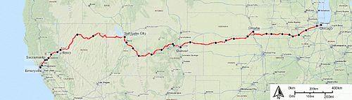 From Salt Lake City to Emeryville, the Zephyr route loosely follows Interstate 80, traveling along the south shore of the Great Salt Lake and across the Bonneville Salt Flats towards Nevada. After crossing into Nevada at Wendover, Utah/West Wendover, Nevada, the route passes the Toano Range, via Silver Zone Pass, across the Goshute Valley, tunnels under the Pequop Mountains and then skirts the northern edge of the Ruby Mountains.