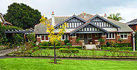 The bungalow in Australia underwent regional adaptations, often being built in the local red brick in Melbourne and the local liver-coloured brick of Sydney,[8] and in limestone in South Australia. The bungalow was also constructed out of timber – in tropical Queensland these were raised on high (2.4 m (8 ft)) stilts as the Ashgrovian Queenslander (the idea being to allow free movement of air in the hot climate). Key practitioners of the California bungalow style were Peddle and Thorp, Kenneth B. Milne, Alexander Stewart Jolly and Cedric Ballantyne. One of the outstanding examples was Jolly's Belvedere in the Sydney suburb of Cremorne. Belvedere is heritage-listed.[9]