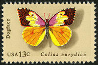 Zerene eurydice, the California dogface butterfly, is sometimes placed in the related genus as Colias eurydice. This species is endemic to California, and is California's state insect symbol.