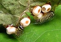 Once the caterpillars hatch, they are fairly solitary. They eat leaves from the edge inwards.[2] The caterpillars eat from several host plants.[5] Caterpillars begin as yellow with black stripes, but become blue green over time. Once they are blue green, they develop four red and one yellow protuberances. These caterpillars go through several instars or skin shedding, and usually after the fifth shedding the caterpillar is ready to form a cocoon.[10] When the caterpillars form cocoons, they are twice as long as they are wide.[11]