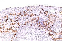 - Lee ES, Leong AS, Kim YS, Lee JH, Kim I, Ahn GH, Kim HS, Chun YK (Mar 2006). "Calretinin, CD34, and alpha-smooth muscle actin in the identification of peritoneal invasive implants of serous borderline tumors of the ovary". Modern Pathology. 19 (3): 364–72. doi:10.1038/modpathol.3800539. PMID 16415795. S2CID 12266907.