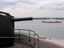 During the 1880s, concerns were raised that Southampton might be vulnerable to French attack using small ships armed with torpedoes.[23] As a result, in 1894 the War Office took the castle back from the coastguard, building a boom across Southampton Water which was moved using three gunboats.[24] The 16th-century castle was too small to host a gun battery to protect the boom, so a larger battery was built south of the old castle in 1895, armed with two 4.7-inch (120 mm) and four 12-pounder (5.4 kg) quick-firing guns, supported by three searchlights mounted on the older castle walls.[25] The boom was managed from two towers called "dolphins", one just beside the castle and the other on the far side of the water, each with two 12-pounder quick-firing guns of their own, in turn supported by machine guns.[26] The creation of these defences ultimately forced the nearby yacht club to move to the southern end of the spit.[22]