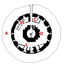In the centre of the castle is the keep, which has an external diameter of 16 metres (52 ft), an octagonal lower storey and circular walls on the upper levels.[57] Originally this held accommodation for the captain and the garrison, but it was heavily redeveloped in the 19th and 20th centuries.[55] Its exterior walls have eight recesses at ground level, originally used to store ammunition for the castle's guns.[57] The basement of the keep was redesigned in the 1890s, when electrical generators were installed, protected by a new, thicker, concrete ceiling.[57] It may originally have been vaulted in stone in a similar style to nearby Hurst Castle.[58]