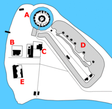 The castle is surrounded by a water-filled, 16-sided moat, 8.8 metres (29 ft) across, accessed over a 20th-century bridge[51] into the gatehouse, an 18th-century design based on a simpler 16th-century original.[54] The gatehouse was altered in 1896, with the addition of brick-built ancillary buildings to the southern end.[54] It was probably intended to provide additional living space for the garrison.[55] The gatehouse leads into what was originally a 16-sided courtyard with 15 gun embrasures round the curtain wall.[56] The wall was lowered to its current height in the 1770s and a concrete building to house searchlights, dating from 1896, now stretches along the southern end of the castle.[56]