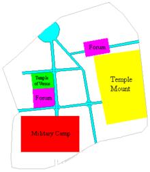 Romans typically built a city according to a Hippodamian grid plan – a North-South arterial road, the Cardo (which is now the Suq Khan-ez-Zeit), and an East-West arterial road, the Decumanus Maximus (which is now the Via Dolorosa).[27] The forum would traditionally be located on the intersection of the two roads, with the main temples adjacent.[27] However, due to the obstruction posed by the Temple Mount, as well as the Tenth Legion encampment on the Western Hill, Hadrian's city had two Cardo, two Decamanus Maximus, two forums,[27] and several temples. The Western Forum (now Muristan) is located on the crossroads of the West Cardo and what is now El-Bazar/David Street, with the Temple of Aphrodite adjacent, on the intersection of the Western Cardo and the Via Dolorossa. The Northern Forum is located north of the Temple Mount, on the junction of the Via Dolorossa and the Eastern Cardo, adjacent to the Temple of Jupiter Capitolinus intentionally built atop the Temple Mount.[28] Another popular holy site that Hadrian converted to a pagan temple was the Pool of Bethesda, possibly referenced to in the fifth chapter of the Gospel of John,[29][30] on which was built the Temple of Asclepius and Serapis. While the positioning of the Temple of Aphrodite may be, in light of the common Colonia layout, entirely unintentional, Hadrian is known to have concurrently built pagan temples on top of other holy sites in Jerusalem as part of an overall Romanization policy.[31][32][33][34][35]