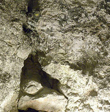 During 1973–1978 restoration works and excavations inside the Church of the Holy Sepulchre and under the nearby Muristan, it was found that the area was originally a quarry, from which white Meleke limestone was struck;[41] surviving parts of the quarry to the north-east of the chapel of St. Helena are now accessible from within the chapel (by permission). Inside the church is a rock, about 7 m long by 3 m wide by 4.8 m high,[41] that is traditionally believed to be all that now remains visible of Golgotha; the design of the church means that the Calvary Chapel contains the upper foot or so of the rock, while the remainder is in the chapel beneath it (known as the tomb of Adam). Virgilio Corbo, a Franciscan priest and archaeologist, present at the excavations, suggested that from the city the little hill (which still exists) could have looked like a skull.[42]