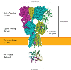 Glutamate receptors are present on the postsynaptic terminal – the two types include ionotropic AMPA- and NMDA receptors. As an excitatory neurotransmitter, glutamate almost always causes an action potential to be triggered on the postsynaptic side – further encouraged by low internal sodium of the principal neurons.[11] In the mature calyx, the AMPA receptors are concentrated on the principal neuron as to localize the transmission for greater action potential probability. Also note, the NMDA-type glutamate receptors contributions decrease after the onset of hearing.[11]