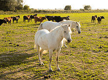 The Camargue is home to more than 400 species of birds and has been identified as an Important Bird Area (IBA) by BirdLife International.[8] Its brine ponds provide one of the few European habitats for the greater flamingo. The marshes are also a prime habitat for many species of insects, notably (and notoriously) some of the most ferocious mosquitos to be found anywhere in France. Camargue horses (Camarguais) roam the extensive marshlands, along with Camargue cattle (see below).