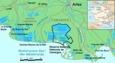 Camargue (/kæˈmɑːrɡ/,[3][4] also UK: /kəˈ-/,[5] US: /kɑːˈ-/,[6] French: [kamaʁɡ]; Provençal: Camarga) is a natural region located south of Arles, France, between the Mediterranean Sea and the two arms of the Rhône delta. The eastern arm is called the Grand Rhône; the western one is the Petit Rhône.[7]
