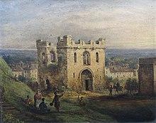 The castle rapidly deteriorated after the slighting and the remaining walls and bastions were taken down in 1785, leaving only the gatehouse and the earth motte.[20] The gatehouse remained in use as the county gaol into the 19th century, being run, like other similar prisons, as a private business — the keeper of the castle gaol was paid £200 a year by the county in 1807[22] (equivalent to £16,000 in 2019).[23]