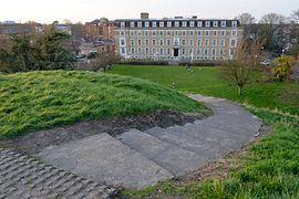 The castle is a Scheduled Ancient Monument.[26] Its only remains are the 10 m (33 ft) high motte (which stands on the highest point in the city) and some fragments of earthworks.[27] It is open to the public daily with no admission fee, and offers views over the historic buildings of the city.[28] The site of the castle bailey and the 19th-century prison is now occupied by Shire Hall, which was built in 1932 as the headquarters of Cambridgeshire County Council.[27]