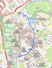 Under Henry II the castle was adequately maintained, but little additional work was undertaken to improve it.[9] A castle-guard system was established, under which lands around Cambridge were granted to local lords on the condition that they provide guard forces for the castle, and the castle was primarily used to hold the sheriff's court and records.[10] King John expanded the castle in the years before the First Barons' War of 1215 to 1217, but this work was concentrated on constructing a new hall and chamber, at the cost of £200.[11][nb 2] During the war, the rebel barons, supported by Prince Louis of France, captured much of eastern England; Cambridge Castle fell in 1216.[13] The castle was returned to royal control after the war, but Henry III only conducted basic maintenance of the fortification.[14] Cambridge was attacked again during the Second Barons' War in 1266.[15] This time the town and castle held long enough to be relieved by Henry's forces, but the king reinforced the city defences with a large ditch, later known as King's Ditch.[15]