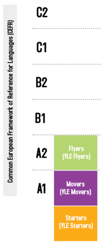 Cambridge English: Young Learners demonstrates language proficiency at various levels of the Common European Framework of Reference for Languages (CEFR). Cambridge English: Starters is focused on pre-A1, Cambridge English: Movers is focused on Level A1 and Cambridge English: Flyers is focused on Level A2.