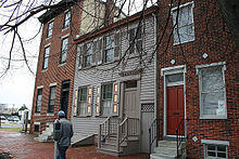 The 1688 order of the County Court of Gloucester that sanctioned ferries between New Jersey and Philadelphia was: "Therefore we permit and appoint that a common passage or ferry for man or beast be provided, fixed and settled in some convenient and proper place between ye mouths or entrance of Cooper's Creek and Newton Creek, and that the government, managing and keeping of ye same be committed to ye said William Roydon and his assigns, who are hereby empowered and appointed to establish, fix and settle ye same within ye limits aforesaid, wherein all other persons are desired and requested to keep no other common or public passage or ferry."[36] The ferry system was located along Cooper Street and was turned over to Daniel Cooper in 1695.[37] Its creation resulted in a series of small settlements along the river, largely established by three families: the Coopers, the Kaighns, and the Mickels, and these lands would eventually be combined to create the future city.[37] Of these, the Cooper family had the greatest impact on the formation of Camden. In 1773, Jacob Cooper developed some of the land he had inherited through his family into a "townsite," naming it Camden after Charles Pratt, the Earl of Camden.[24][25]