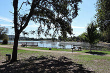 Adjacent to the Airpark Estates sits man-made Cameron Park Lake. Covering approximately 10 acres (4 ha), the area contains a trail encircling the lake, picnic areas, boat rentals, tennis courts, playgrounds, as well as a sandy beach and swimming area separated from the main lake by an earthen dam. Turtles and aquatic fowl can be seen at the lake, and the Community Services District regularly stocks the lake with fish including bluegill, black bass, and black crappie fish. Cameron Park Lake is also the site of the annual "Summer Spectacular" held on or about the Independence Day holiday. Since 1999 this event has provided entertainment, food, and a fireworks show to attendees. Cameron Park Lake is also the home of "Ribstock," a one-day barbecue festival that features a Kansas City Barbeque Society-sanctioned barbecue competition.
