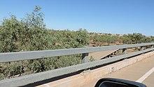 Given the economic importance of transport on the Barkly Highway (the only sealed road between Queensland and the Northern Territory), a longstanding problem was the flooding of the Georgina River at Camooweal. During floods, the Barkly Highway bridge over the Georgina River was often unusable for many days , with road trains and other heavy vehicles having to wait weeks before it was safe to cross. To alleviate these problems, the new Georgina River Bridge was officially opened on 20 December 2002 by Senator Ron Boswell and Steve Breadhauer, Minister for Transport in the Queensland Government. It replaced the previous bridge which was approximately 50 metres (160 ft) south and was both higher and longer so traffic on the highway could continue to cross during floods. The bridge is 417 metres (1,368 ft) long and is accompanied by a 5.6-kilometre (3.5 mi) highway deviation west from Camooweal. The bridge uses an unusual arch design to avoid placing pylons into the river bed which is culturally significant to the local Dugalunji people, who call the new bridge Ilaga Thuwani meaning The Camping Ground of the Rainbow Serpent.[23][24][25][26]