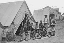 By November 15, 1861, Camp Douglas housed about 4,222 volunteer soldiers from 11 regiments.[24] By February 1862, the recruits suffered 42 deaths by disease.[24] According to George Levy's 1999 history of the camp, a total of about 40,000 Union Army recruits passed through the camp for outfitting and training before the facility was permanently converted to a prisoner-of-war camp.[25] A 1960 history by Eisendrath estimated the number of recruits as 25,000 based on his sources at the time.[26] Colonel Tucker's job as camp commander was not easy; he had to use increasingly hard measures to curb considerable drunk and disorderly conduct by recruits in camp. He also had to supervise their conduct and sometimes take punitive action against them for acts in the city of Chicago, where the soldiers abused pass privileges.[27]