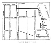The camp ran west four blocks from Cottage Grove Avenue to the present Martin Luther King Drive.[17] Its northern boundary was what is now East 31st Street, and its southern boundary was the current East 33rd Place, which then was named College Place.[17] A gate in the south fence of the camp provided access to the 10-acre property (4.0 ha) donated by Senator Douglas to the Old University of Chicago, which had opened in 1857 at its site on Cottage Grove Avenue and 35th Street.[8] A smallpox hospital, four rows of garrison barracks, and an Illinois Central Railroad station were located on the former Douglas property.[18]