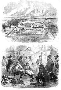 Dr. Edward D. Kittoe of the surgeon general's office inspected the camp on January 18, 1864.[124][125] He found the severely overcrowded barracks deep in filth and mud, and swarming with vermin due to the lack of flooring.[124] Cooking was deficient and garbage littered the streets.[124] Old sinks (latrines) were not sealed properly and waste was seeping to the surface.[124] Dr. Kittoe gave high marks to the hospital but noted that 250 sick men remained in barracks because the hospital's 234 beds were full.[126] He found that thirty-six percent of the prisoners were ill, and fifty-seven prisoners had died in December 1863.[126] The guards also were suffering from the poor conditions at the camp, with twenty-nine percent ill and six deaths among them in December 1863.[126] Dr. Kittoe concluded the camp was unfit for use, but it remained in use.[126]