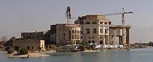Construction of the Victory Over America Palace was commissioned by Saddam Hussein following his assertion of victory over the US, ending the 1991 Gulf War. Construction was brought to an abrupt halt during the shock and awe campaign of the US in 2003, receiving a direct hit and leaving one of the construction cranes standing limp, with its boom collapsed from the explosion. The Victory Over America Palace was constructed immediately behind, and adjacent to, the smaller Victory Over Iran Palace. The two palaces are frequently confused for a single building, and one or both are sometimes mislabeled.