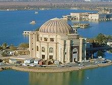 Ba'ath Party Recreation Palace was located in the center of a manmade lake, just southeast of Baghdad's International Airport. The building was split into four main quadrants, one of which suffered a direct hit during the US shock and awe campaign. The four quadrants are separated by two covered, air conditioned boat landings. The quadrants consisted of a theater, ballroom, conference room and swimming pool. Shortly after the 2003 US invasion, the building was heavily looted.