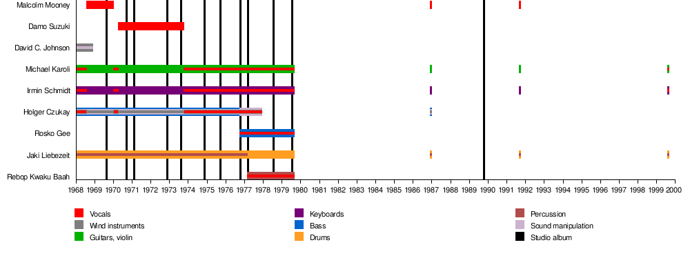| Past members | Michael Karoli Jaki Liebezeit Irmin Schmidt Holger Czukay Malcolm Mooney Damo Suzuki David C. Johnson Rosko Gee Rebop Kwaku Baah |