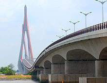 Today, Cần Thơ is connected to the rest of the country by National Route 1A and Cần Thơ International Airport. The city's bridge, which is now completed, is the longest cable-stayed bridge in south-east Asia. The six-lane Saigon–Cần Thơ Expressway is being built in parts from Hồ Chí Minh City to Mỹ Tho. Hydrofoil express boats link this city with Hồ Chí Minh City. From Phú Quốc island, tourists can use the ferry, passenger bus or taxi to transfer to Cần Thơ.[8] There are many vehicles such as taxis, Grab motorbikes, buses, vans and coaches.