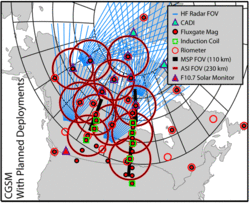Anticipated CGSM stakeholders met in Edmonton in June 2002 to initiate planning for the program. An ambitious plan was settled on, requiring numerous new instruments of various types to be deployed in challenging remote environments. The instruments would need to operate autonomously for long periods, and suffer few breakdowns. Much of the data would need to be recovered in real-time in order for CGSM to develop into an important space weather program, in addition to its space science objectives. New instruments would need to be acquired, outfitted and fielded at existing and new sites. To accomplish this, the team settled on using Telesat Canada's HSi High Speed Satellite Internet system, in conjunction with an information technology infrastructure (basically a glorified local area network with additional capabilities including UPS, GPS, and attached hard-disk storage). Further, members of the team applied to the Canada Foundation for Innovation for funds for new instruments, and were successful on all fronts. The resulting funding enabled the deployment (which is still ongoing) of an additional 8 All-Sky Imagers, 14 fluxgate magnetometers, 8 induction coil magnetometers, and two additional SuperDARN radars (the new "PolarDARN" radars). In addition to facilities that were already in place in 2002 (from the Canadian Space Agency's CANOPUS[3] program, the Natural Resources Canada CANMOS magnetometer array, and the NSERC supported NORSTAR, SuperDARN, and CADI programs), the final array will certainly meet the scientific requirements.