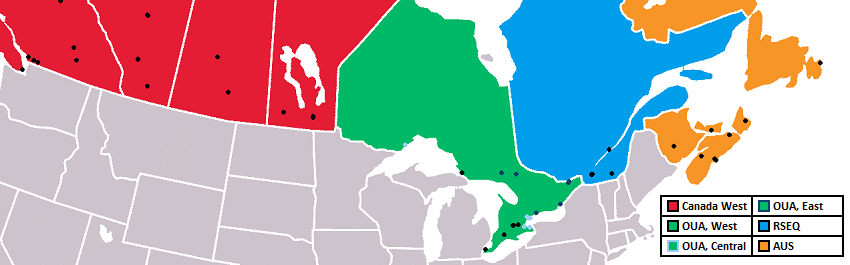 There are 56 member universities in U Sports.[11] These 56 member universities are currently organized into the four following regional associations. In some of these sports, these associations are sometimes referred to as conferences.
