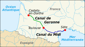 The Canal de Garonne, formerly known as Canal latéral à la Garonne, is a French canal dating from the mid-19th century which connects Toulouse to Castets-en-Dorthe. The remainder of the route to Bordeaux uses the river Garonne. It is the continuation of the Canal du Midi which connects the Mediterranean with Toulouse.