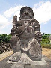 Most of larger temple compound in ancient Java were guarded by a pair of dvarapala statues, as gate guardians. The twin giants usually placed flanked the entrance in front of the temple, or in four cardinal points. Dvarapala took form of two fierce giants or demons that ward off evil and malevolent spirits from entering the sacred temple compounds. In Central Javanese art, dvarapala is mostly portrayed as a stout and rather chubby giant, with fierce face of glaring round goggle eyes, protruding fangs, curly hairs and moustaches, with fat and round belly. The giant usually depicted as holding gada and sometimes knives as weapon.